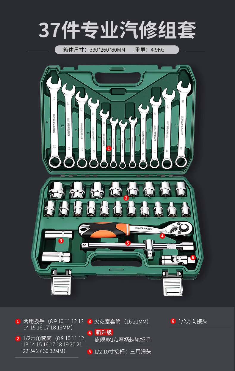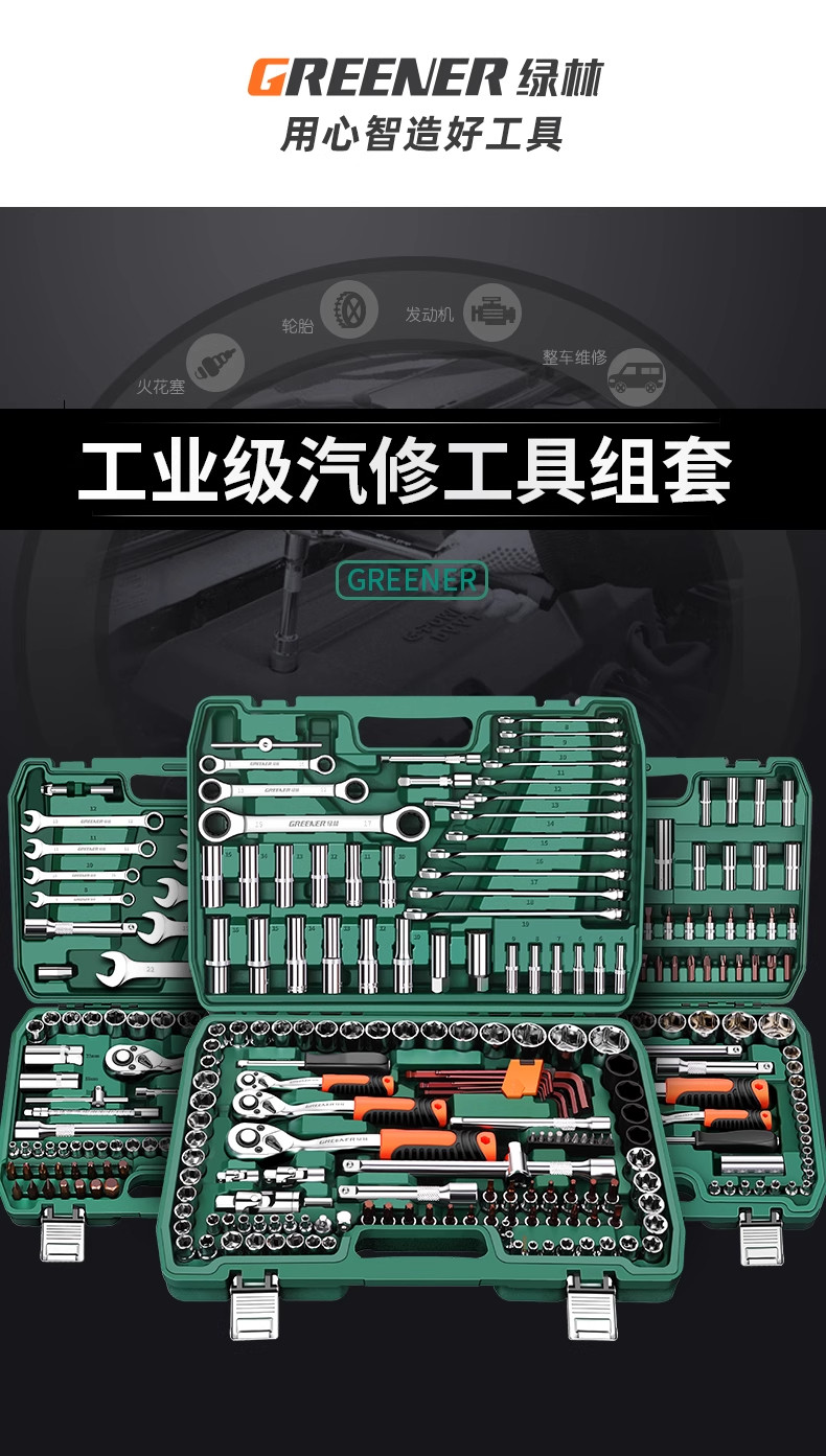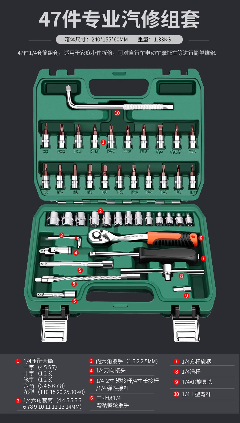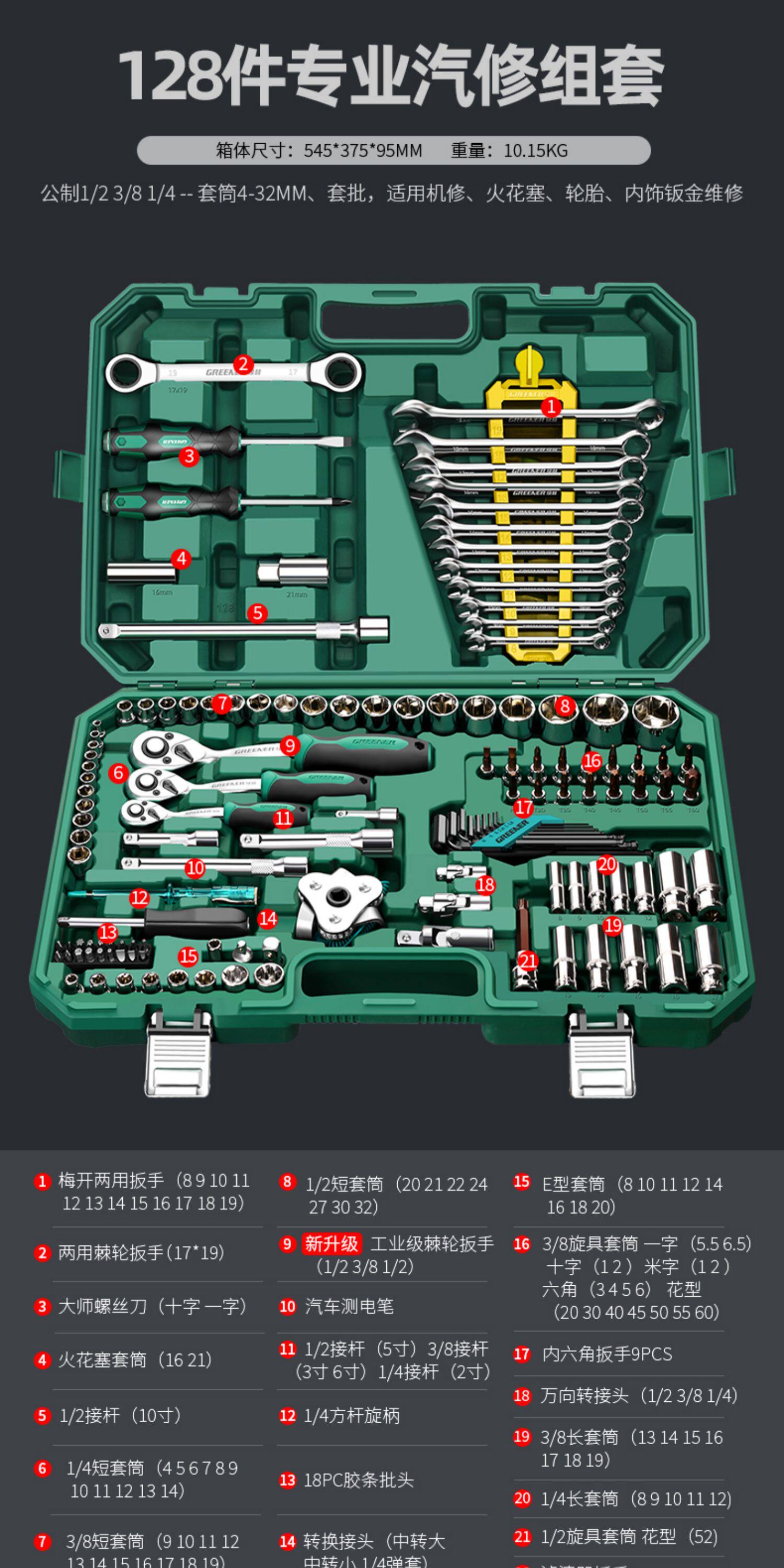 绿林汽修工具套装套筒扳手棘轮汽车维修工具箱多功能1/4寸套筒扳手组合修车