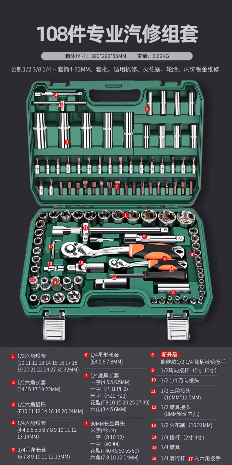 升级72齿弯柄汽修108件套