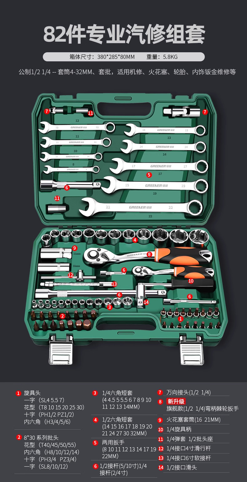 【旗舰款】72齿弯柄汽修82件套