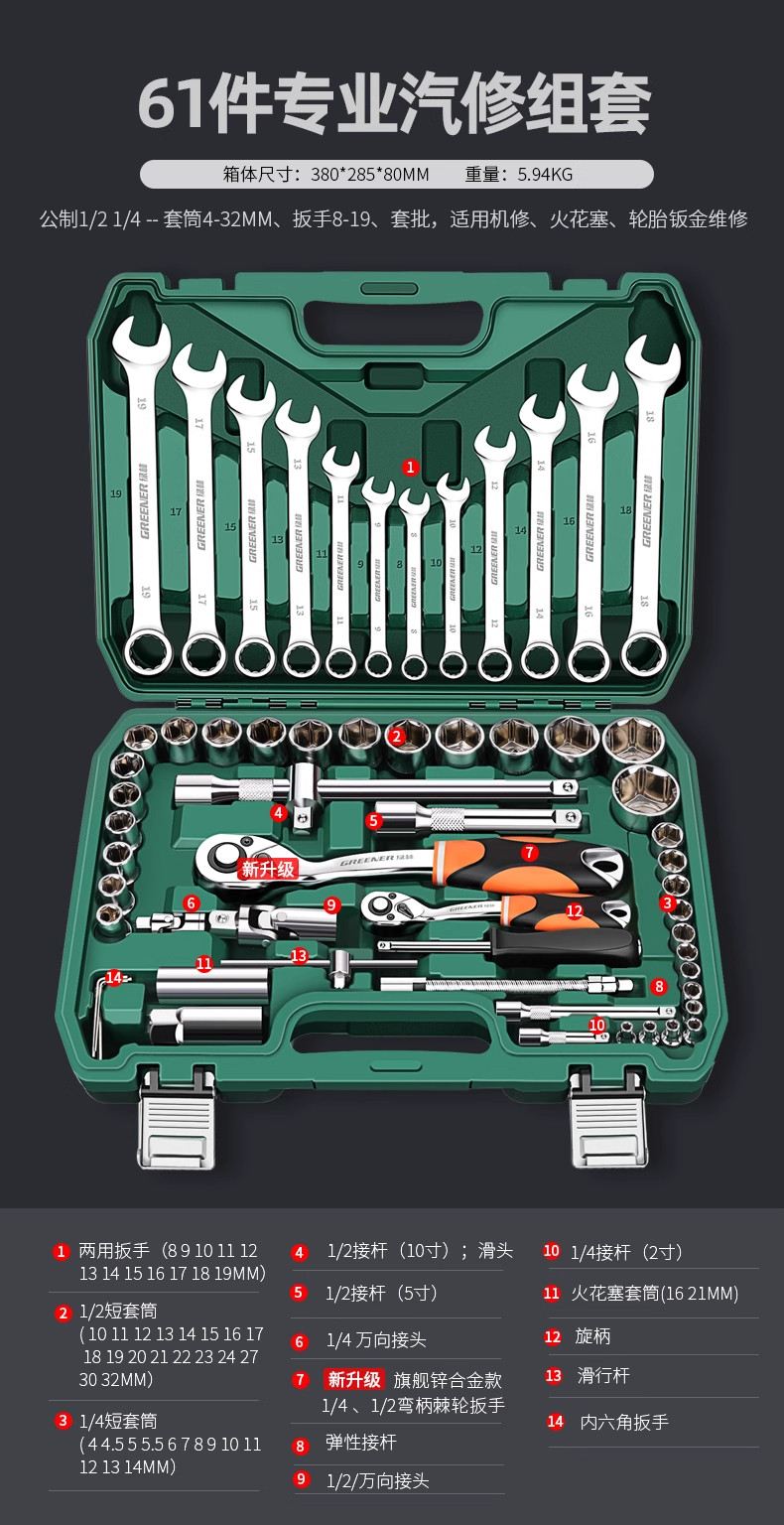 升级72齿弯柄汽修61件套